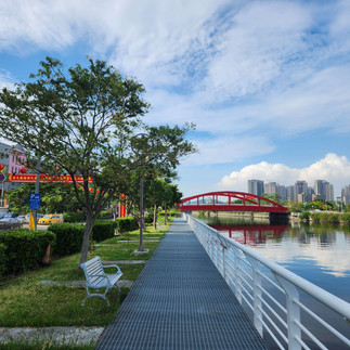 I turned into another narrow twisting neighborhood of neat apartment buildings, and rode along a cycle-way made of an old train track, leading into a railroad park with the old trains and turntables as public art. This was also just a large recreational park and there were people playing soccer, tennis, and doing exercises. Ahead of me I saw signs for the portuary area and the customs building- Kaohsiung is the main import location for all of Taiwan. To the south-east was the old port docs, now turned into Qijin Island, and literally everyone I know recommended I ride my bike there. I sort of forgot that that existed and instead turned right, and road through a neighborhood, then a long pedestrian tunnel to the Sun Yat Sen University. Now that I looked into it more, this is evidently a rich-kid, foreign-study-abroad, party-time school, with a focus on arts and marine biology. With that caveat, it was a beautiful and spacious in a way that I had not gotten to observer yet in Kaohsiung. There were plants everywhere, including ficus tendrils wrapping around buildings that grew near trees. Students walked between buildings and along paths. Very little car traffic, lots of flashy mopeds. I was going up to a sunset spot, past "Monkey Point" where I did see a monkey climbing a wall! While cute, they are very interested in human food and will mess with your belongings and steal your snacks if you get too close.