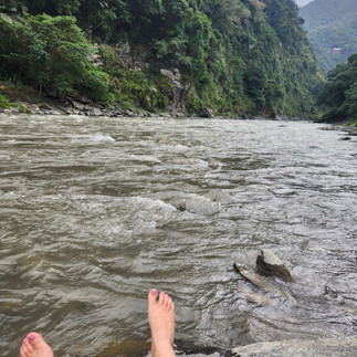 If you know me, you know I'm a river baby, so this was pretty wonderful for me. I had the challenge of the water, the sky and mountains and folliage for my eyes, very gentle rain hitting my face, and such happiness that I took this trip bouncing in my heart. I took a break from swimming and stood in the shallower area, stretching my legs. The sand below me was actively warm, warmer than the water. I started to think that this was the area with the hot spring in it, and look closer at the behavior of the people nearby. There were 5-10 older people milling around the area to my right, on the far side of this big rock. I had assumed they were swimming, fishing, homeless, washing clothes, or just out for a stroll, but I looked closer ( I hadn't want to stare at first) and it was definitely possible they were doing things you do before and after you dunk in super hot water- stretching, drinking tea, breathing deeply. There were some makeshift tents set up with bamboo polls and tarps, and life vests and life rings strung up along the retaining wall that held up the road above. A person would climb up on a concrete slab that I has assumed was just for erosion prevention, and they'd climb down into the rock!